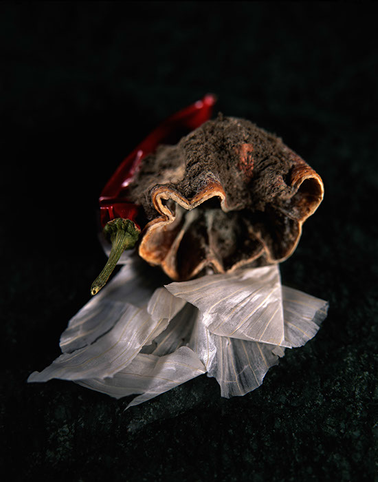 These images are a part of a series concerning "rot", or more precisely the beauty of rot. A large part of my work as a food photographer involves using the youngest and freshest produce. For clients everything has to be perfect. Ultimately, the danger is that this perfection may lead to a "plastic" look. Increasingly, however, I find that it is the minor flaws and imperfections that add character and appetite appeal and attract and hold the attention of the viewer for longer.