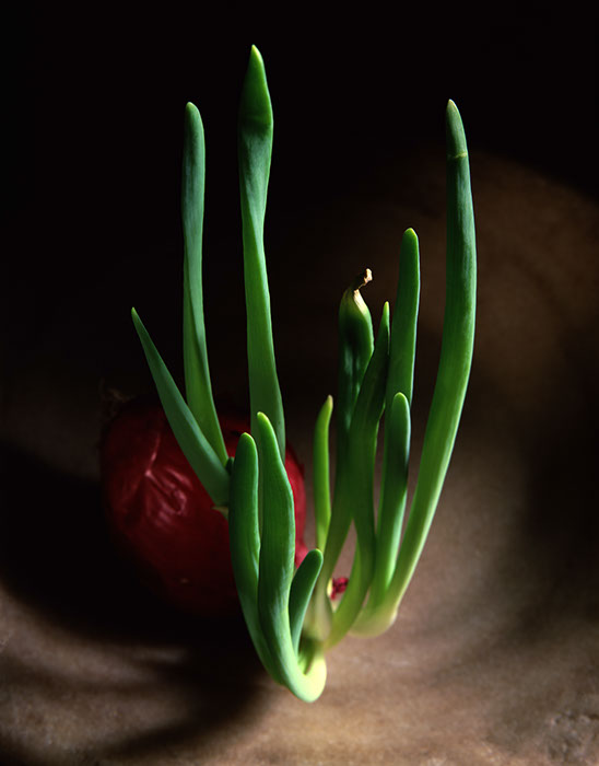 My series on rot takes this to an extreme. As the produce dries out, it goes through many stages and takes on new and varied textures. Some items, like onions, go through a rebirth and sprout beautifully green in contrast to the red wrinkled bulb.
